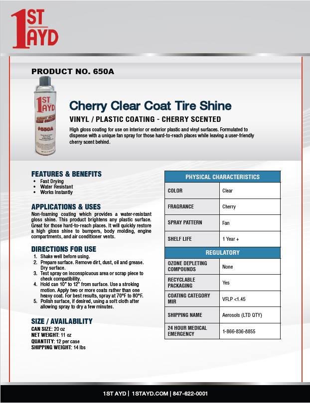 Cherry Ultra Clear Coating with a cherry scent, non-foaming, water-resistant, high gloss coating that instantly brightens and renews vinyls and plastics, even in hard to reach areas.