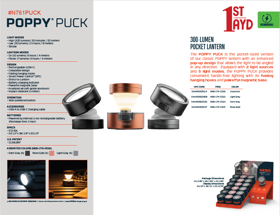 Nebo Poppy Puck 300 Lumen Pocket Lantern Rechargable -EACH